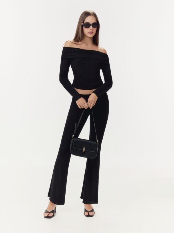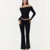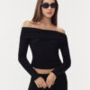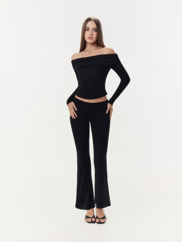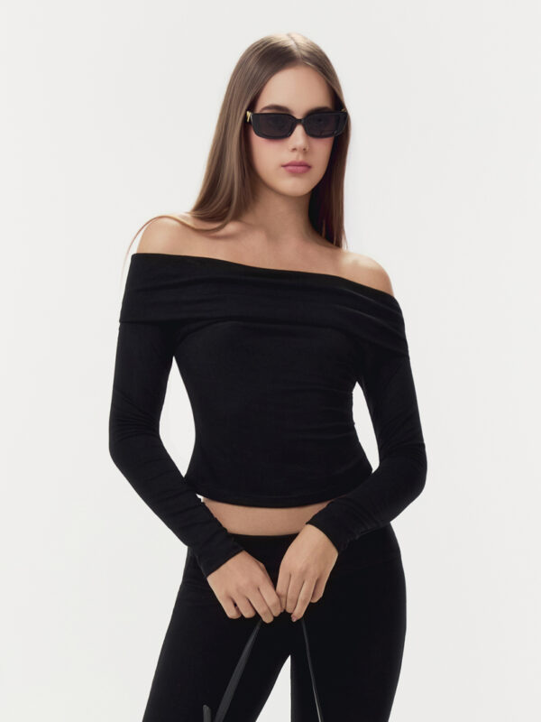 Thiết kế cổ trễ ngang bản rộng bao phủ vai và bắp tay, kết hợp các nếp gấp vải xếp lớp tự nhiên, tạo hiệu ứng mềm mại và cân đối phần thân trên.