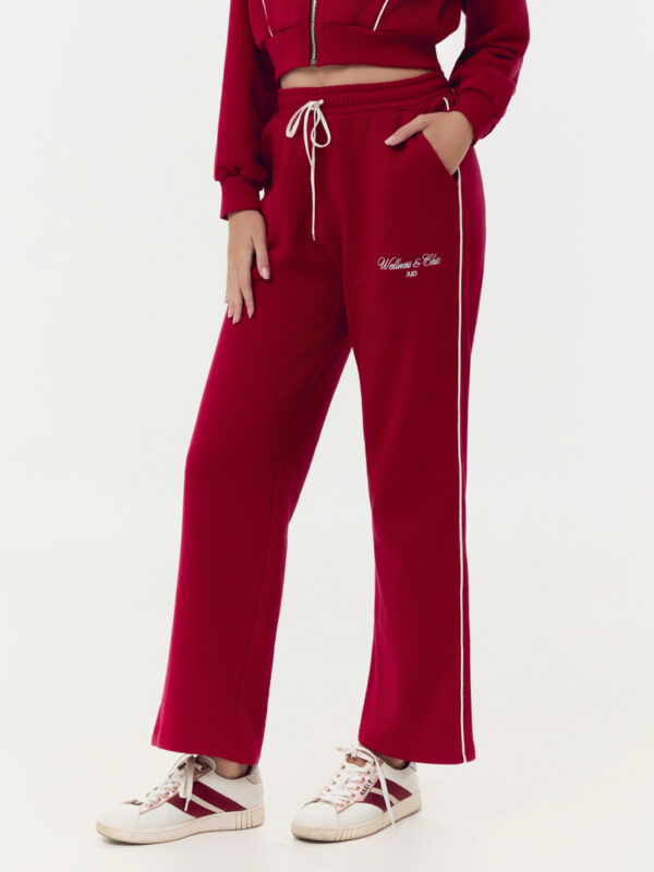 Áo khoác dáng crop-top cổ trụ với khóa kéo kim loại toàn thân, phần bo gấu ôm nhẹ eo giúp cân đối tỉ lệ cơ thể. Quần thể thao dáng suông, cạp chun kèm dây rút linh hoạt, mang lại cảm giác thoải mái khi di chuyển. Điểm nhấn nằm ở đường viền trắng chạy dọc cầu vai áo và sườn quần, cùng chi tiết thêu logo và chữ tạo nét thể thao đặc trưng.