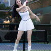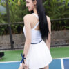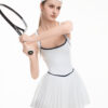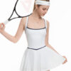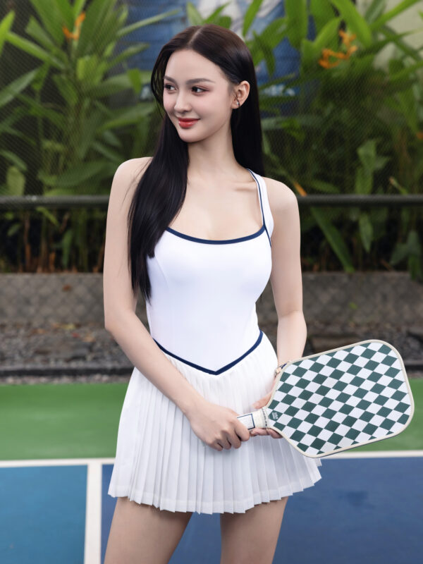 Kiểu dáng váy liền thân với thiết kế tập trung vào phom dáng và đường nét cơ thể. Phần lưng đan chéo kết hợp viền màu tương phản tạo điểm nhấn thị giác tinh tế, giúp tổng thể trở nên gọn gàng và nổi bật hơn.